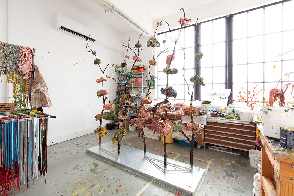 Finding inspiration from the natural environment and co-existing ecosystems, her work transcends the boundaries of traditional landscape painting, becoming an embodied reflection of it. Observing the concept of an Anthropocenic Landscape, where resource use has irreversibly altered natural systems, the sculpture features organic forms crafted entirely from eight years of recycled paint off-cuts, built up with wet paint like glue. The layered paint remnants contain traces and residues of past landscape paintings, each containing its own narrative and memory; reflecting earthly strata, and the layered histories of the landscape itself.